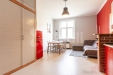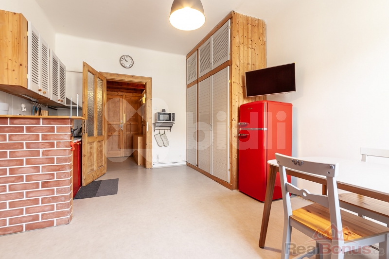 V prostorném pokoji (21 m2) s kuchyňským koutem vybaveným plynovým sporákem v kombinaci s elektrickou troubou a digestoří jsou vestavěné skříně.
