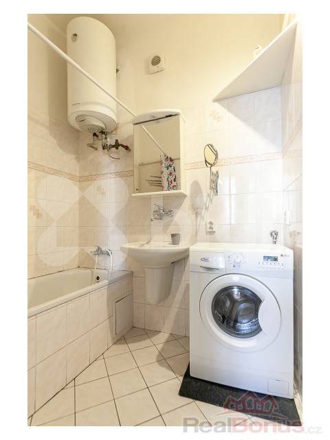 V koupelně (3,4 m2) vana, elektrický kotel (noční levný proud) na teplou vodu, umyvadlo a pračka. Výhodou je samostatná toaleta.
