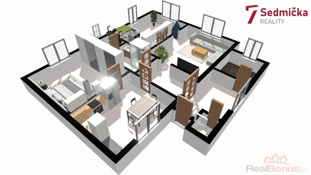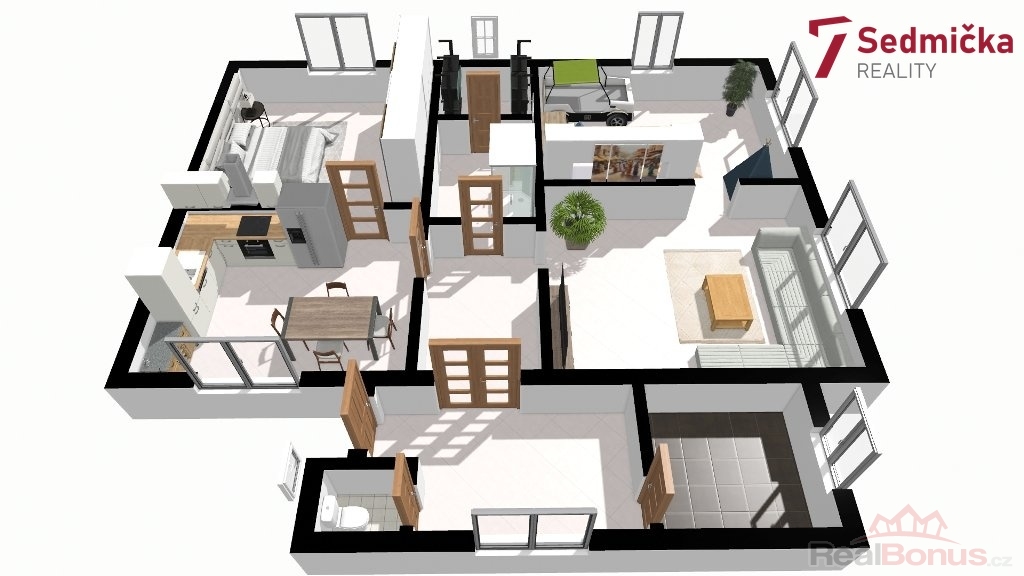 Obytnou část bytu tvoří byt 3+1 tvořený vstupní verandou s WC, chodbou, kuchyní, třemi pokoji, koupelnou a špajzkou. Byt je vytápěný radiátory s kotlem na TP. Na obytnou část domu navazuje průjezdná stodola se sklady (bávalé chlévy) a garáží. Na konci domu vedle garáža je vybudovaný kuník s výběhem pro chov slepic. Zahrada kolem domu má trojúhelníkový tvar a svojí rozlohou a členitostí může nabídnout také hodně prostoru například k dětským hrám. Z pozemku kolem domu je hezký výhled na lesy a panorama Železných hor - velmi pěkné a klidné místo.