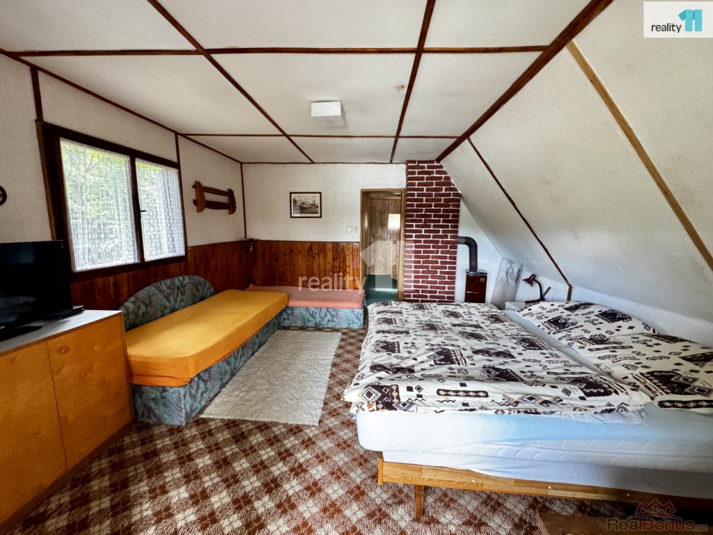 Podkroví: chodba s novým dřevěným obložením, vestavěnou skříní a posezením. Velký pokoj se čtyřmi lůžky (vytápění kamny Petra) s terasou s nádherným výhledem na přehradu a menší pokojík s palandou.