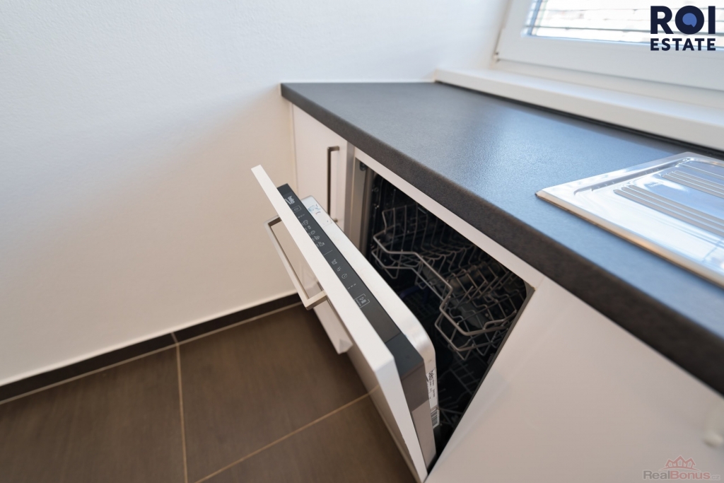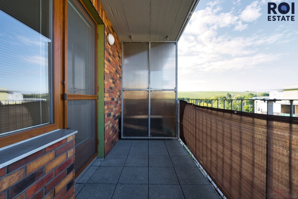 Byt o velikosti 49 m2 s balkonem 4 m2 působí velmi světlým a čistým dojmem. Obývací pokoj je propojený s moderní kuchyní ve vysokém lesku, která je vybavena vestavěnými spotřebiči včetně myčky, varné desky, trouby a lednice s mrazákem. Z obývací části je vstup na balkon s příjemným výhledem do okolí.