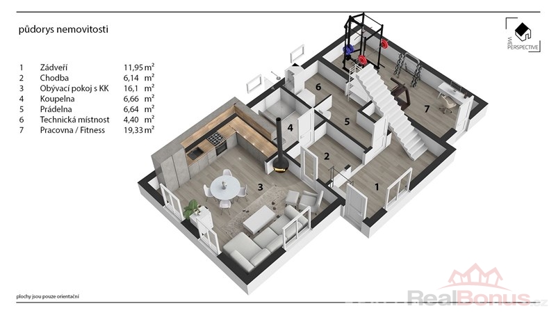 Přízemí je dělené na zádveří a předsíň, obývací pokoj s krbovou vložkou, vybavený kuchyňský kout s lux. vestavěnými spotřebiči, koupelnu se sprchovým koutem a prádelnou s toaletou a tech. místnost se šatnou. Původní garáž je využívaná jako klidová zóna ve které se nachází infrasauna a mini fitness, vstup ze zahrady. Na zahradě krásná krytá pergola, zahradní domek ........