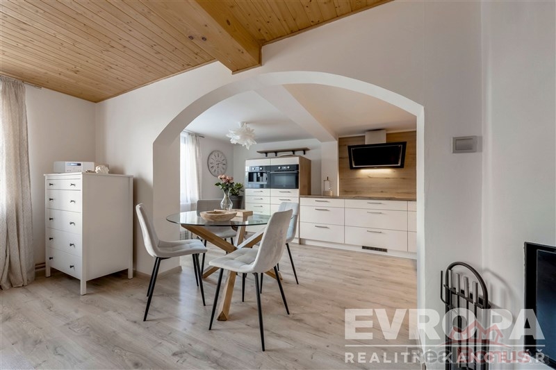 Interiér je dokonalým propojením dřeva, doplněné o designovou dlažbu, luxusní spotřebiče a hlavně je zde na každém kroku cítit otisk vkusného a praktického využití každého koutu.