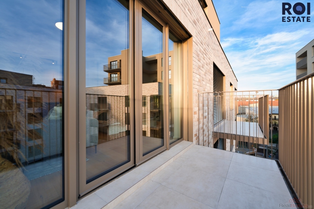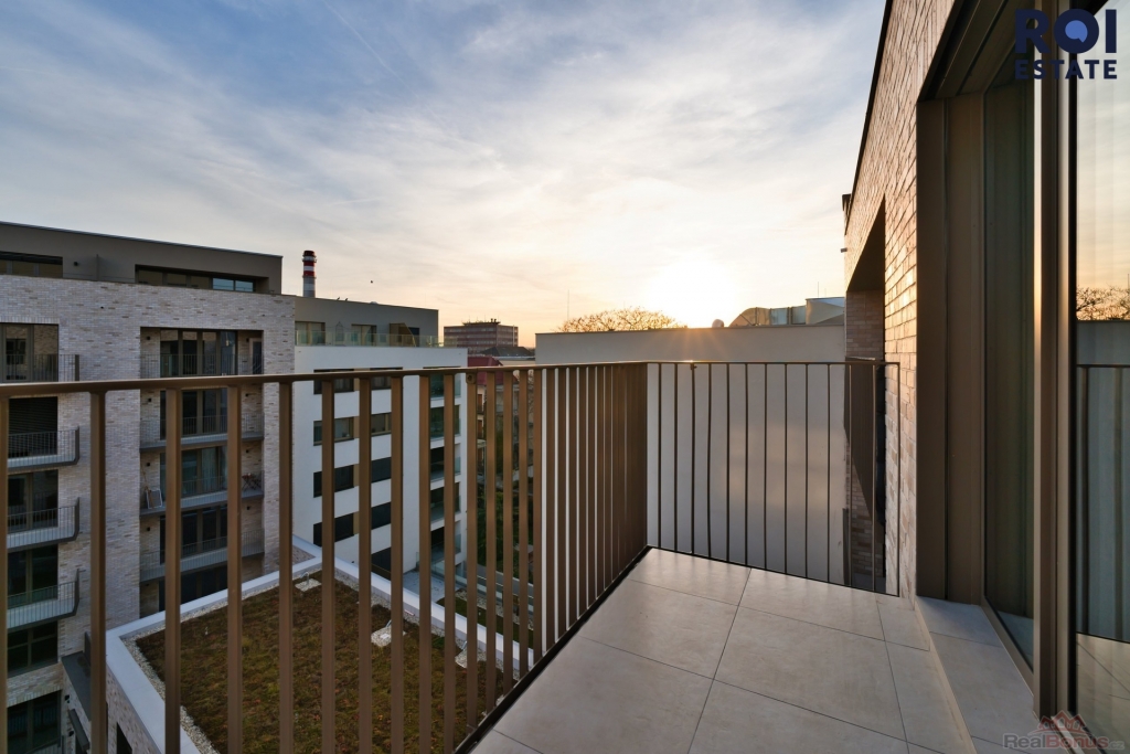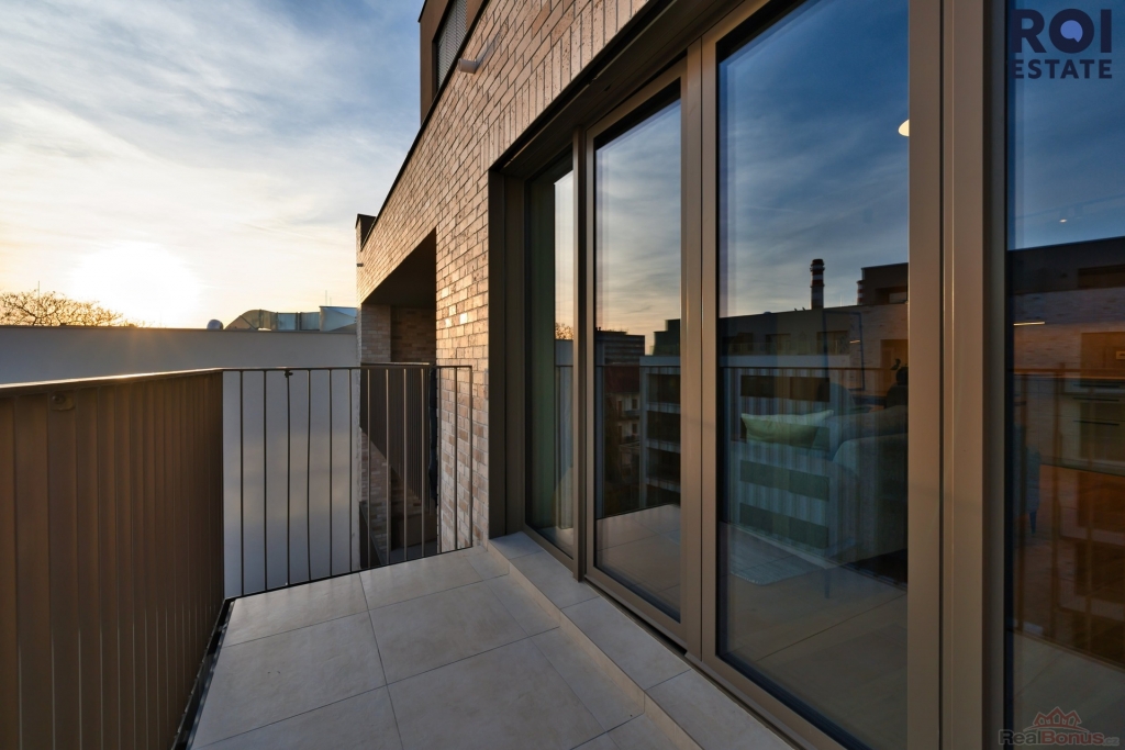 Balkon jeprostorný s příjemným výhledem do vnitrobloku projektu. Ideální místo pro večerní relax.