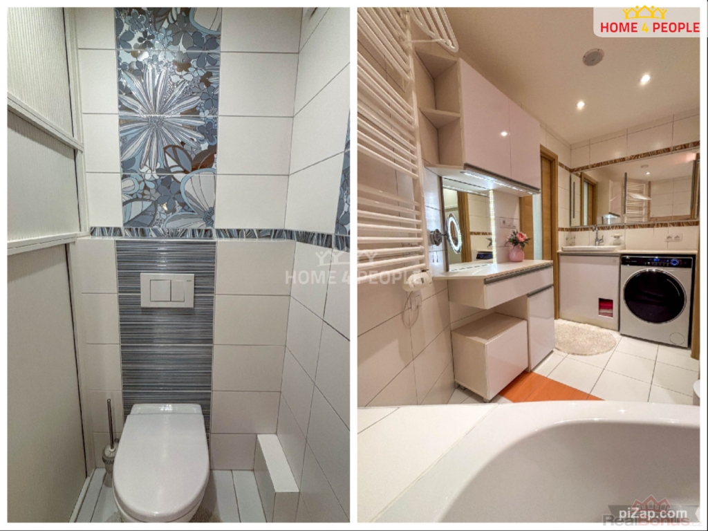 Koupelna (5,3 m) vybavená vanou, pračkou a kosmetickým stolem. Toaleta (1,4 m)