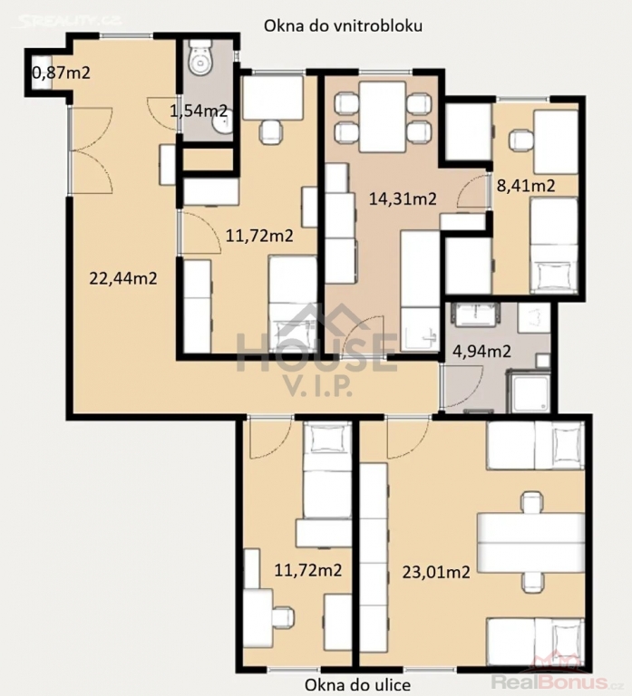- Vybavení: kuchyňská linka, spotřebiče, nábytek pokojů, pračka, lednice.