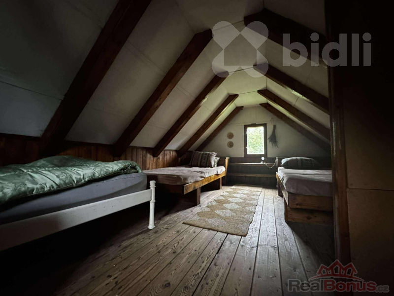 v podkroví se nachází příjemná místnost, kterou lze využít jako ložnici nebo prostor pro odpočinek.