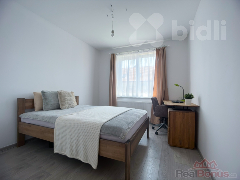 Na opačné straně domu se nachází klidová zóna s ložnicemi a koupelnou. Hlavní ložnice nabízí dostatek místa pro manželskou postel i úložné prostory. Druhá ložnice je ideální jako dětský pokoj, pracovna nebo pokoj pro hosty.