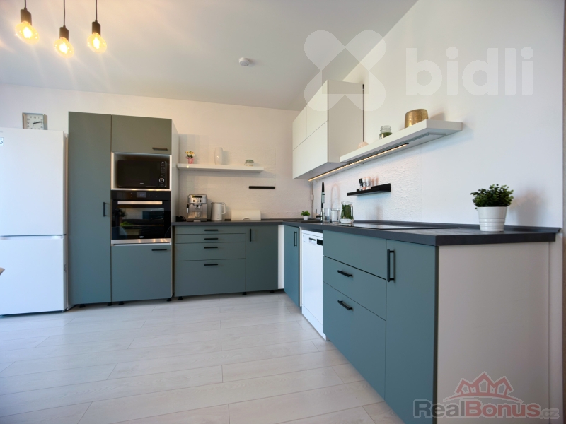 Dále z chodby vstoupíte do hlavní obytné části domu, kterou tvoří kuchyně spojená s obývacím pokojem. Tento otevřený prostor je ideální pro společné rodinné chvíle a nabízí dostatek prostoru pro kuchyňskou linku, jídelní stůl i pohodlnou sedací soupravu.