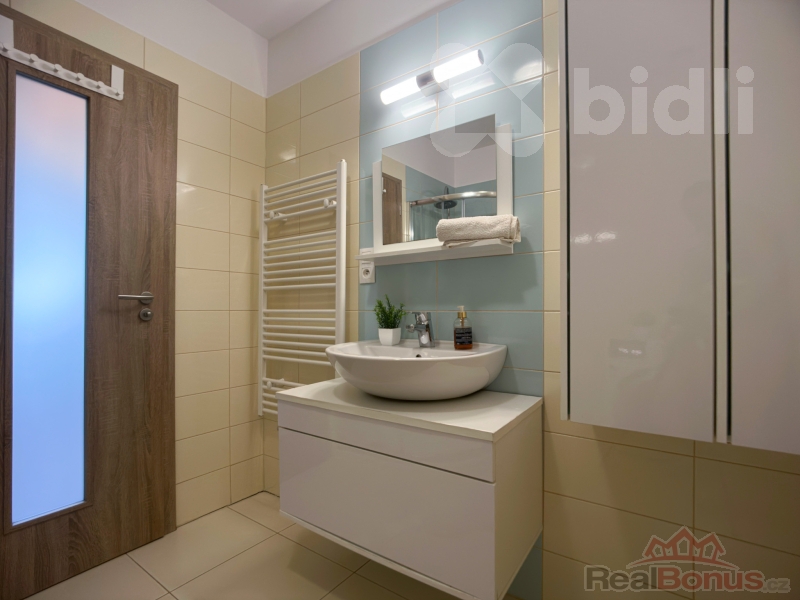 Mezi ložnicemi je umístěna koupelna, ve které se nachází sprchový kout, umyvadlo a samostatná toaleta.