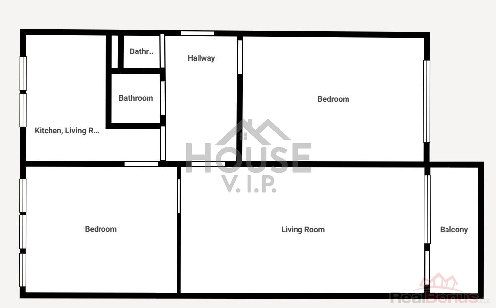 Dispozice bytu: prostorný obývací pokoj (22,4 m2) se vstupem na zasklenou lodžii (3,4 m2), samostatná kuchyň (8,9 m2), ložnice (16,7 m2), další pokoj (13,9 m2), koupelna s vanou (2,1 m2), samostatné WC (1 m2) a předsíň (5,9 m2).