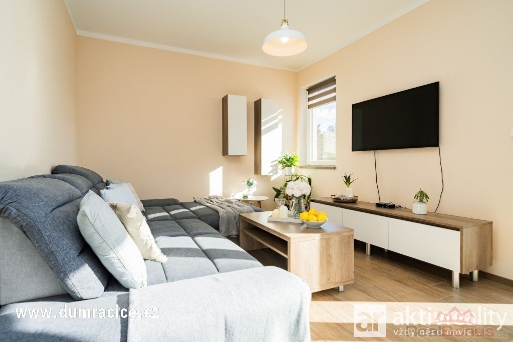 Hledáte moderní nízkonákladové bydlení a k tomu ?druhý prostor? navíc? Nabízíme zděný bungalov 4+kk (2020) na pozemku 999 m2 v obci Račice u Štětí. Součástí prodeje je také samostatný zateplený mobilheim cca 50 m2 ? ideální pro hosty, pracovnu, zázemí pro rodinu nebo případně pronájem.