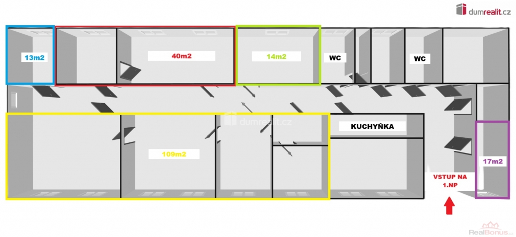 (+ zálohy na energie a služby), Dumrealit.cz Vám zprostředkuje pronájem kanceláře 40m užitné plochy. Kancelář se nacházejí v 1.NP cihlové budovy na okraji Podivína. Kancelář je tvořena dvěma místnostmi (26,5m a 13,5m) každá má vstup z centrální chodby, ale jsou i průchozí navzájem. V jedné z místností se nachází přívod vody a odpad, čímž tu vzniká možnost vybudovat si kuchyňku. Sociální zázemí naleznete na centrální chodbě, společné pro celé patro. Budova je součástí rozlehlého areálu, který je opatřen závorou. Parkování možné před areálem nebo přímo v areálu za poplatek 300,- Kč/auto. Nájemné činí 3.000,- Kč, zálohy na energie a služby budou nastaveny dle vytíženosti a počtu osob. Při podpisu smlouvy bude požadována úhrada vratné kauce 12.000,- Kč a provize RK ve výši 1měsíční nájemné +DPH. V nabídce další rozměry kanceláří, možno kombinace více prostorů nebo rovnou celého patra. Prostory jsou volné, připravené k okamžitému užívání. Kontaktujte nás pro více informací a domluvte si prohlídku. Ev. číslo: 651170. Energetický štítek: G