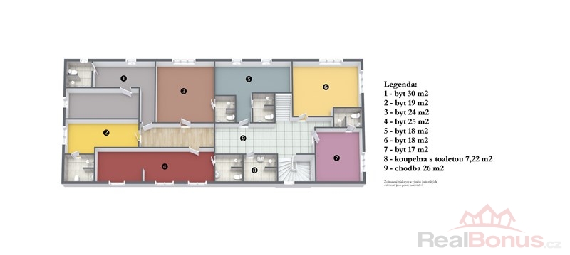 Podkroví: chodba, 7 ubytovacích jednotek, koupelna s wc a schody na půdu.