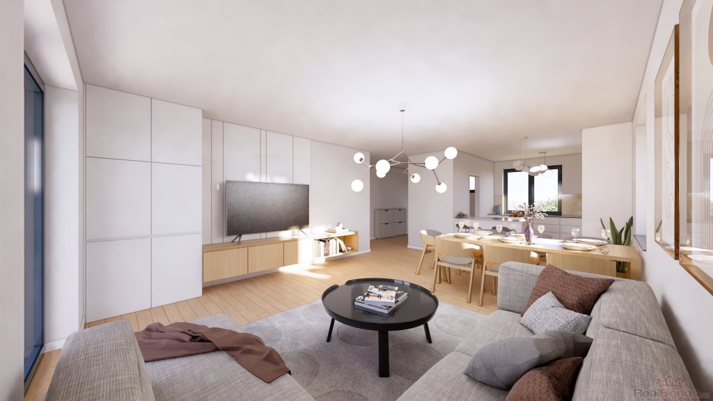 Interiér domu je navržen s důrazem na funkčnost a komfort. Hlavní obytný prostor tvoří světlý obývací pokoj propojený s moderní kuchyní, což vytváří ideální prostředí pro rodinné setkání a společné chvíle. Velká okna zajišťují dostatek přirozeného světla a umožňují výhled do zahrady, která je skvělým místem pro relaxaci a venkovní aktivity.