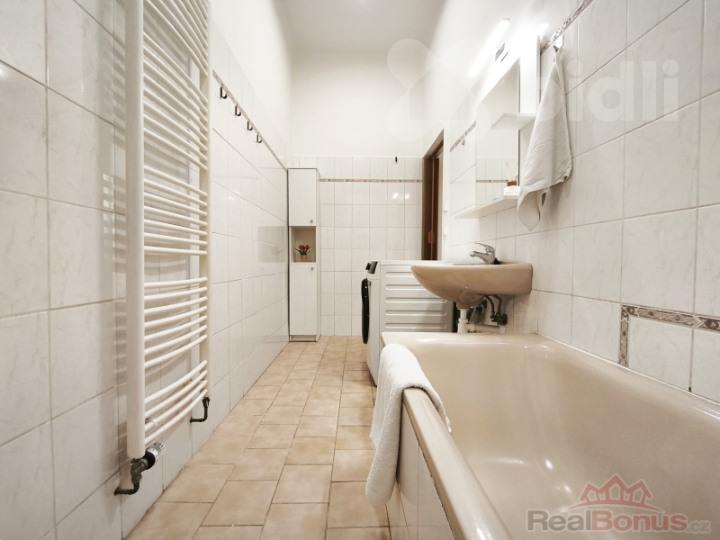 * Koupelna s vanou, umyvadlem, otopným žebříkem, pračka se sušičkou