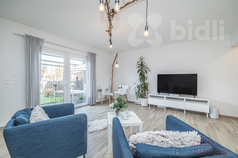 V 1. nadzemním podlaží se nachází vstupní chodba s úložnými prostory, prostorný a světlý obývací pokoj s kuchyňským koutem a přímým vstupem na zahradu. Dále je zde samostatné WC a technická místnost.