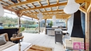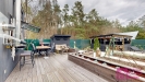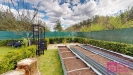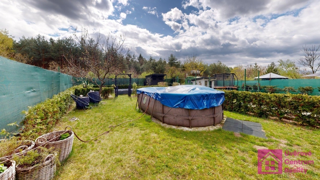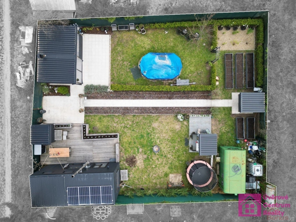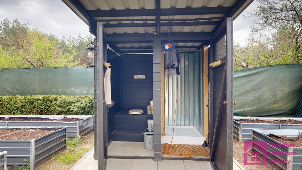 Pergola s krbem a zástěnami s paletovým posezením, matracemi, stolem z palet a skla. Dvě venkovní boudy. V první je úschovna na kola plus malý sklep a ve druhé keramické wc, kamenné umyvadlo a sprchový kout na solární sprchu. Zelená maringotka pro úschovu nářadí atd. 5x vyvýšené záhony, nadzemní bazén s příslušenstvím, trampolína, dětský domeček s terasou. Velká terasa s levandulemi, stůl a paletové posezení s matrací a šicím strojem na boty jako stoleček. Veškeré solární osvětlení zahrady a dva bečáry na dešťovou vodu.