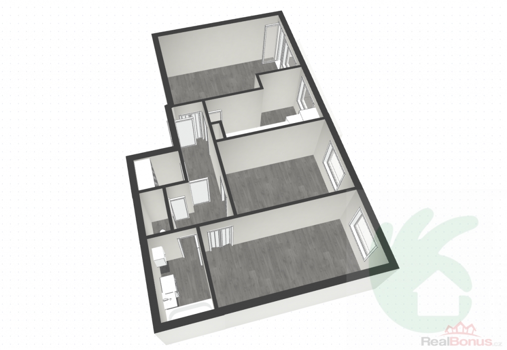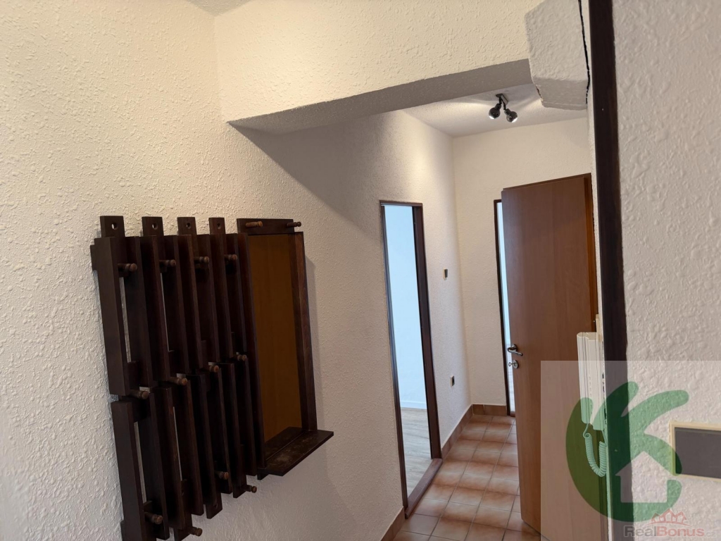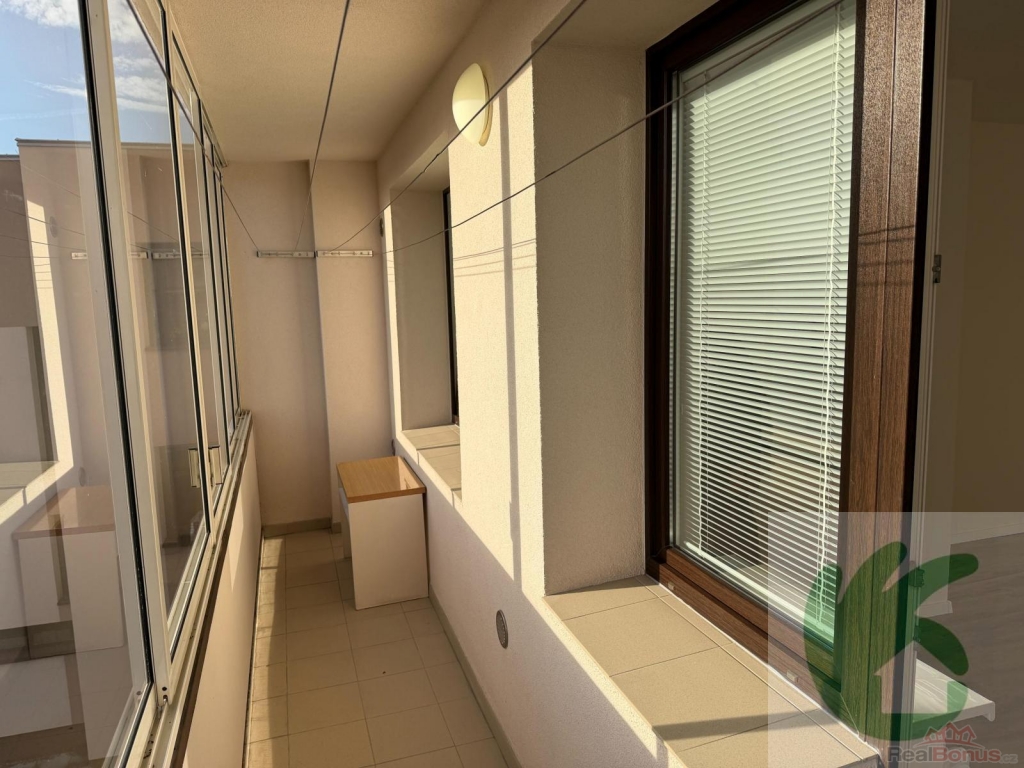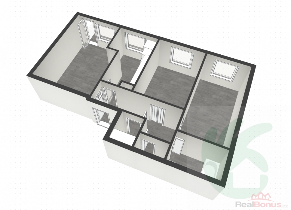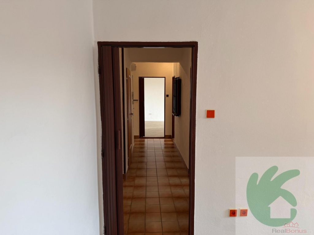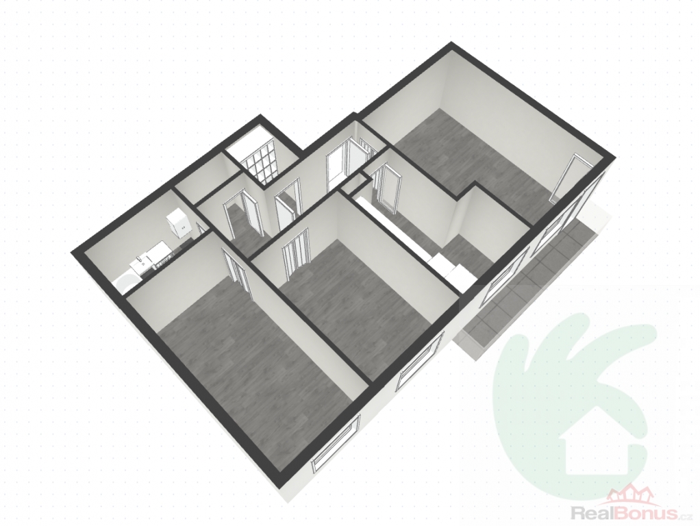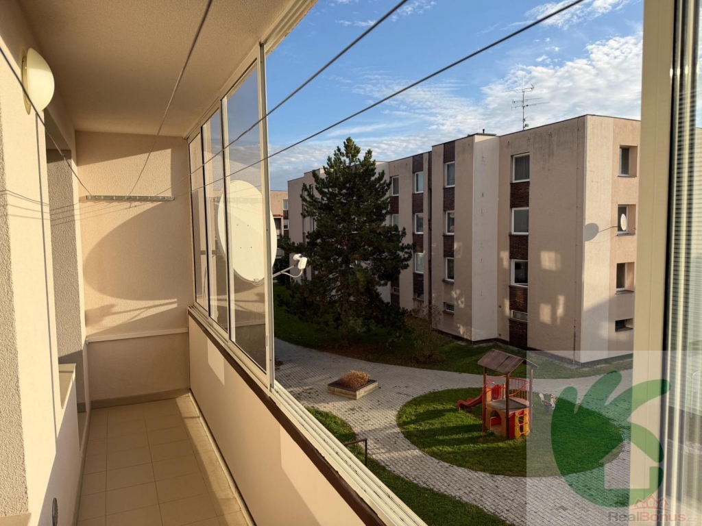 Byt je tvořen chodbou s dlažbou a svítidlem odkud je vstup do koupelny s vanou umyvadlem a pračkou, samostatnou toaletou a do dvou neprůchozích ložnic. Další dveře Vás zavedou do kuchyně s vestavnými spotřebiči (lednice, myčka, plynový vařič digestoř, vestavná trouba a mikrovlnka). Dále pokračujeme do obývací místnosti s vinylovou podlahou a svítidlem, z obývacího pokoje vstoupíte na prostorný zasklený balkón.
