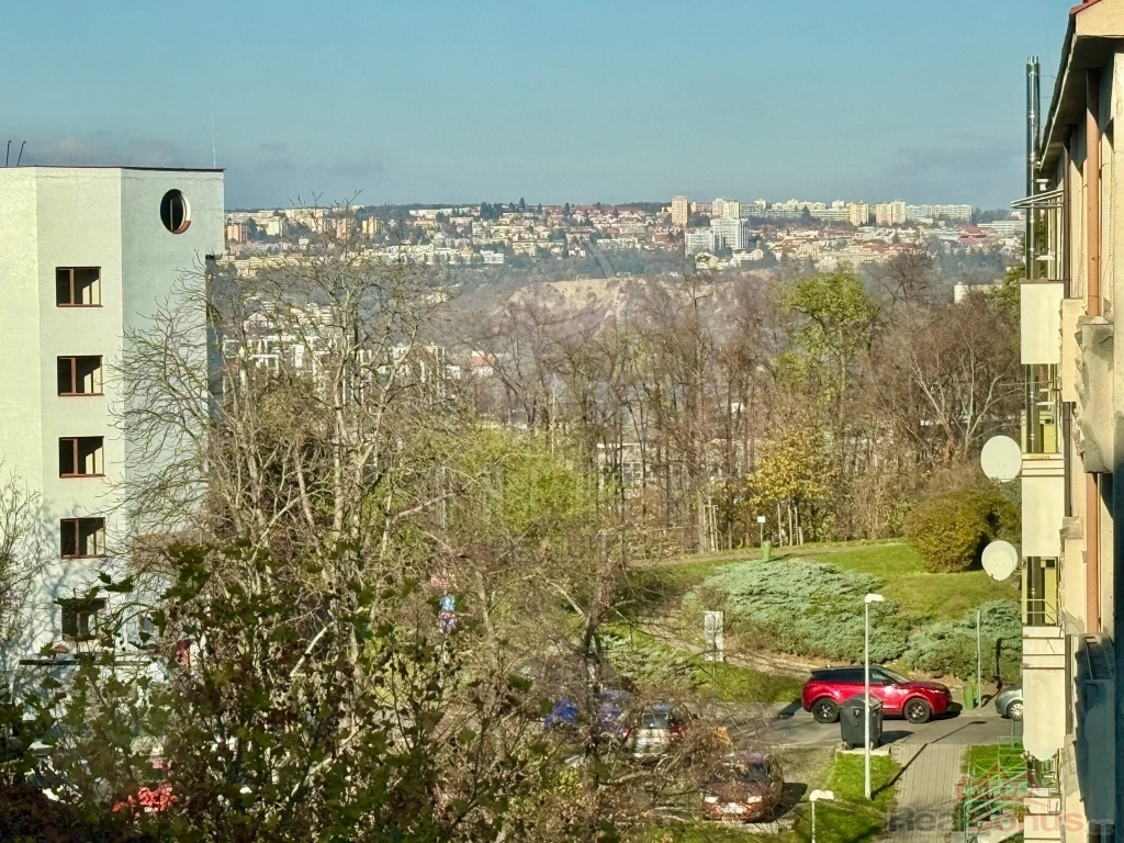 Byt byl kolaudován jako 1+1, ale oddělením části kuchyně u okna vznikla menší ložnice oddělená příčkou a posuvnými dveřmi. Proto má nyní byt funkčně dispozici 2+kk. Z ložnice je průhled mezi domy přes park Pražačku nad zákrut Vltavy a na protější svah Troji a okolí.