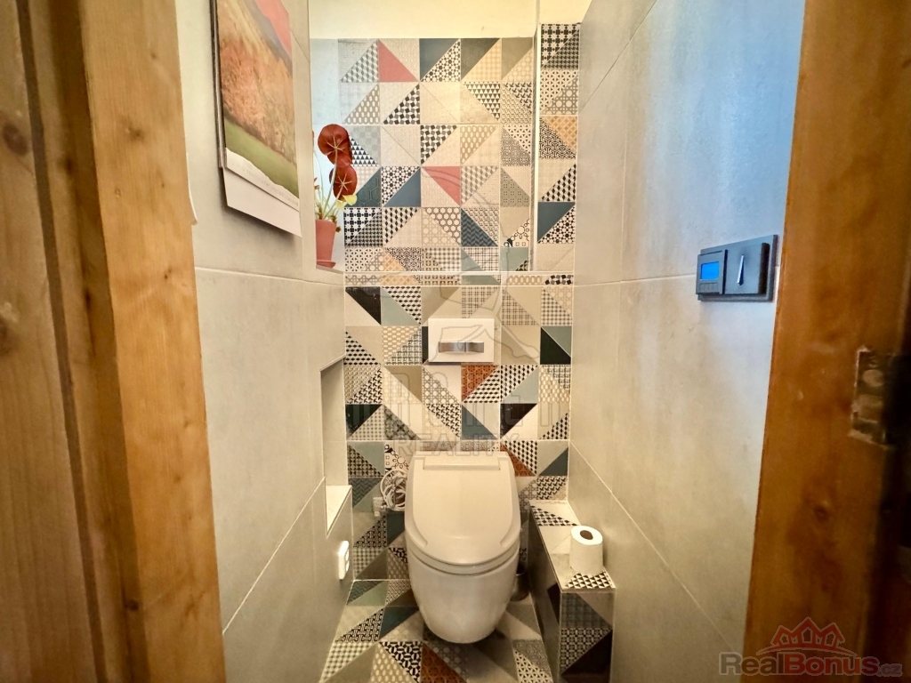 Z předsíně je vstup do koupelny s rohovou vanou a umyvadlem. Je zde také místo pro pračku. Toaleta má samostatnou místnost. Obě tyto místnosti mají podlahové topení. Z předsíně je také vstup na balkón 1,3m2.