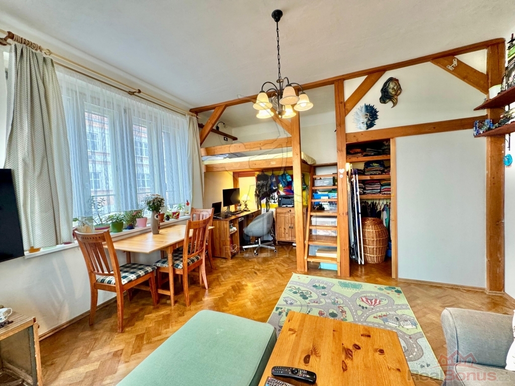 Obývací pokoj je světlý a prostorný. Zahrnuje obývací část s sedací soupravou a stolkem, jídelní část s jídelním stolem. Dále lehkým patrem rozdělený prostor na pracovní kout se stolem, šatnu s posuvnými dveřmi a dvojpostel a úložný prostor na patře. Pokoj je širokým průchodem napojen na kuchyňský kout vybavený designovou linkou ve tvaru U. Ta je plně vybavena spotřebiči včetně keramické varné desky a je zde spousta úložného prostoru.