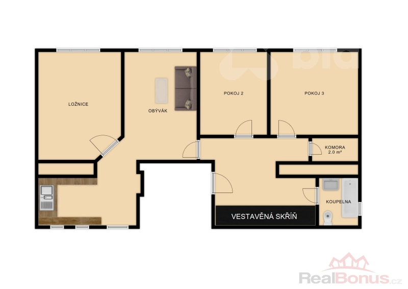 - 3 samostatné neprůchozí pokoje.