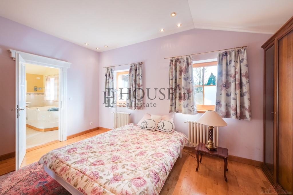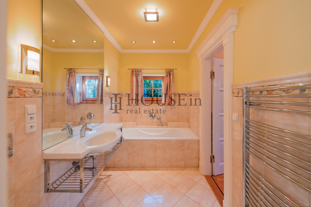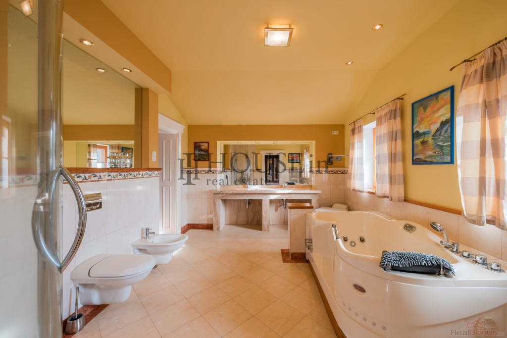 Kuchyňská linka je kompletně vybavena ? dřez a baterie zn. Franke, odsavač Miele, varná deska a trouba Siemens, mikrovlnná trouba Siemens, drtič odpadu, halogenové osvětlení a další prémiové prvky. V kuchyni jsou navíc elegantní pracovní desky ze žuly, které podtrhují nadstandardní úroveň vybavení. V obývacím pokoji v přízemí a v ložnici v patře se nachází mramorem obložený krb s vložkou, který dodává interiéru výjimečnou atmosféru a zároveň doplňuje systém vytápění. Ve všech pokojích jsou provedeny fabiony ? zaoblené přechody mezi stěnou a stropem, které interiéru dodávají luxusní a čistý vzhled. Nábytek na fotografiích může zůstat po dohodě. Mezi speciální vybavení patří masážní sprchový kout zn. Jacuzzi, vířivá vana La Futura Aqualina, centrální vysavač a venkovní zděný gril. Internetové připojení je zajištěno přes bezdrátovou parabolickou anténu od internethned.cz nebo lze připojit klasickou telefonní linku.