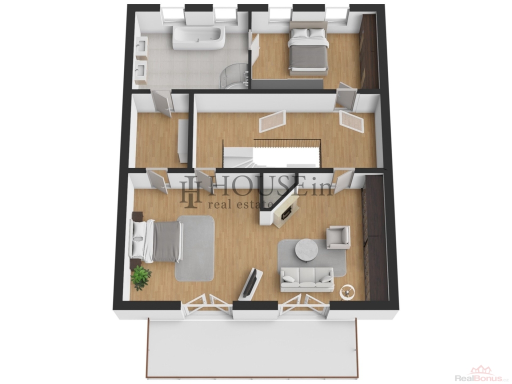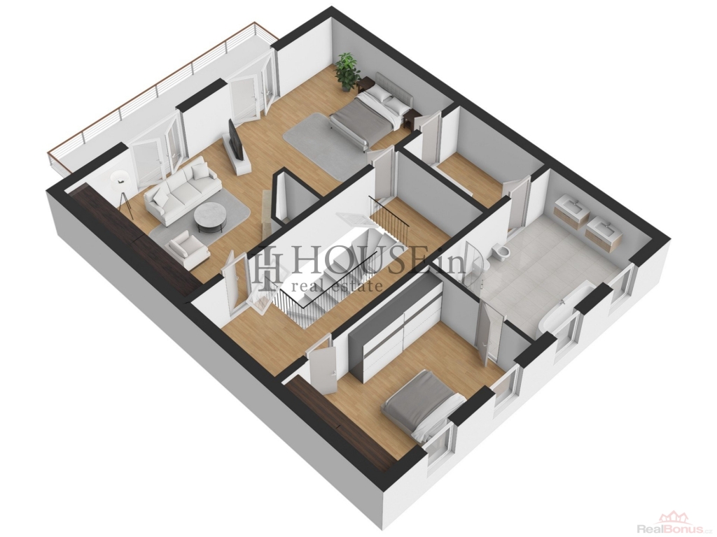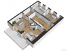 Podkroví - galerie, hlavní ložnice, šatna, koupelna s toaletou, druhá ložnice a balkon.
