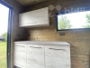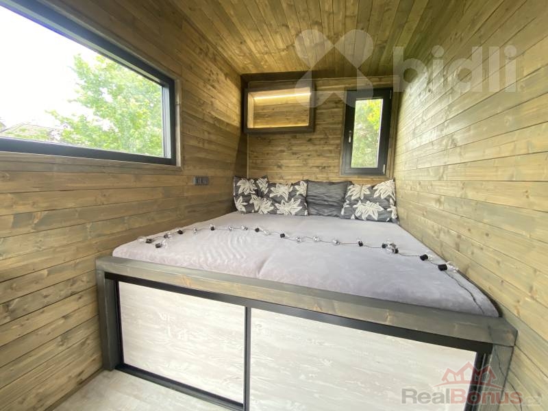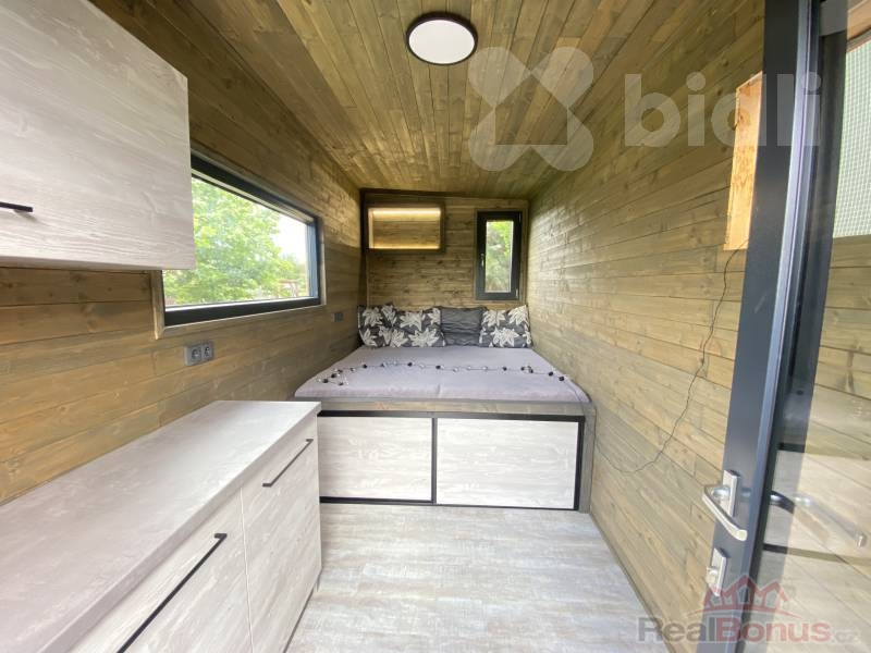 Uvnitř se nachází postel s úložným prostorem a novými matracemi, malá praktická kuchyňka a vinylová podlaha, která je nejen hezká na pohled, ale i snadná na údržbu. Plastová okna a dveře (dodávané se třemi klíči) zajišťují dostatek světla a zároveň dobrou izolaci. Součástí je kompletní elektroinstalace včetně osvětlení. Pro vytápění je připraven průchod komína, který umožňuje snadné připojení kamen dle vlastního výběru.