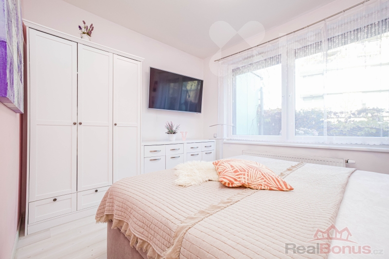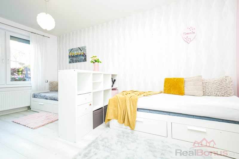 Dvě ložnice orientované na sever se vstupem z jedné z nich na terasu o velikosti 5 m2 a na 14 m2 předzahrádku směřující do klidného vnitrobloku se zelení, což zajišťuje stabilní teplotu a klidný spánek i během letních měsíců.