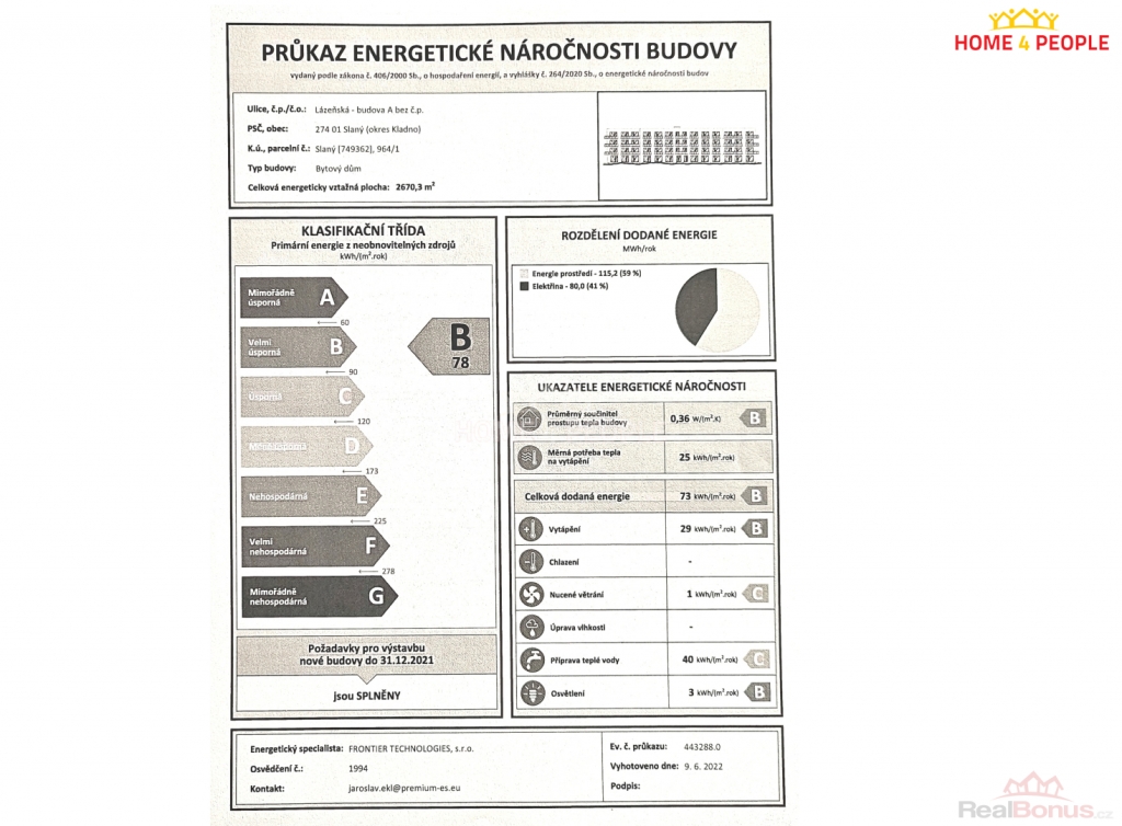 +popl. 8000, , Zprostředkujeme Vám výhradní pronájem nového bytu o dispozici 2+KK o celkové ploše 78 m (BYT 58 m + TERASA 20 m + GARÁŽOVÉ STÁNÍ V DOMĚ). Byt se nachází ve čtvrtém nadzemním podlaží (3. patro) čtyřpodlažního nového domu s výtahem ve městě Slaný, v ulici Lázeňská. Byt je v osobním vlastnictví, nikdy nebyl ještě obýván. Disponuje ložnicí, obývacím pokojem s kuchyní, předsíní, prostornou šatnou, koupelnou s vanou a toaletou. Z obývacího pokoje a ložnice je možno vstoupit na vlastní prostornou terasu s výhledem k jihu do zeleně. V suterénu domu je k dispozici vlastní kryté garážové stání. V bytě je následující vybavení: kuchyňská linka se spotřebiči - lednice, myčka, digestoř, el. sporák s el. troubou, pračka, televize, postel, skříně, stůl židle, osvětlení atd.. Nová plastová okna s roletami směřují k jihu na terasu s výhledem do zeleně okolo domu, v bytě jsou umístěny nové radiátory, na podlaze je položena plovoucí podlaha a dlažba. Bytový dům byl kolaudován v roce 2023 - průkaz energetické náročnosti budovy - třída B, společenství vlastníků velmi dobře funguje. V domě je zaveden ústřední ohřev vody a tepla, Internet je zaveden. Správa domu velmi dobře funguje. Parkování je rovněž bezproblémové v okolí budovy. V dané lokalitě je veškerá občanská vybavenost, zejména - škola, školka, kostel, kino, restaurace, lékař, lékárna, pošta, nákupní středisko. Je zde krásné a klidné bydlení v zeleni blízko centra města. Dopravní obslužnost - 20 min od Letiště Václava Havla. Rezervace možná ihned, k nastěhování ihned!!! Doporučujeme osobní prohlídku, jedná se o komfortní a klidné bydlení vhodné pro rodiny s dětmi, popř. pro pracovníky letiště. Velmi doporučujeme osobní prohlídku!! Ev. číslo: 32013. Energetický štítek: B (78 kWh/m2/rok).