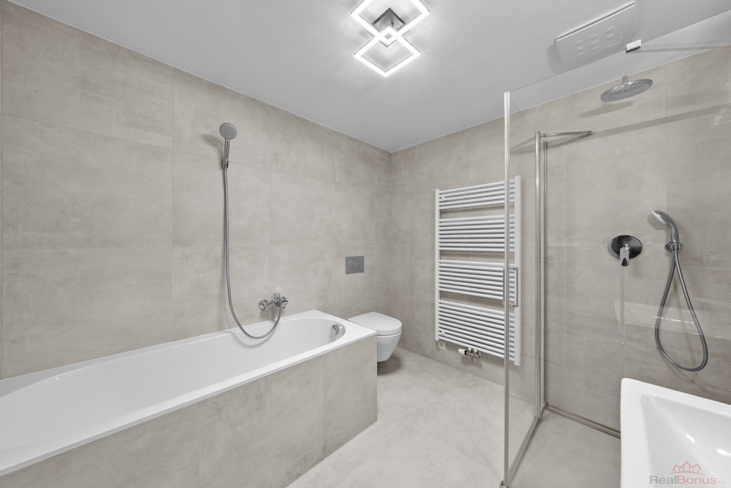 Klimatizace 4x, příprava na screenové a venkovní rolety, koupelna s WC (vana, sprchový kout, umyvadlo, WC, připojení na pračku a sušičku).