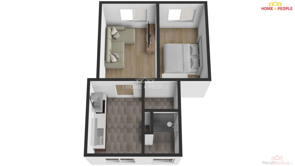 obývací pokoj propojený s ložnicí (otevřený prostor, bez dveří)
