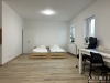 Koupelna se sprchovým koutem, WC, umyvadlem a přípojkou na pračku. Pokoj může být zařízen (postel, skříň, pracovní stůl a židle).