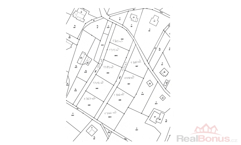 K dispozici jsou parcely o výměrách 1265 m2 až 1418 m2. Cena 1.990 až 2.390 Kč /m2.