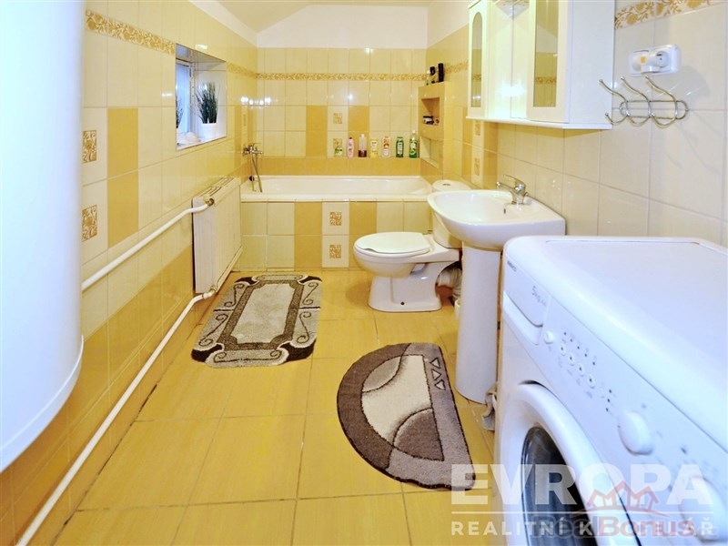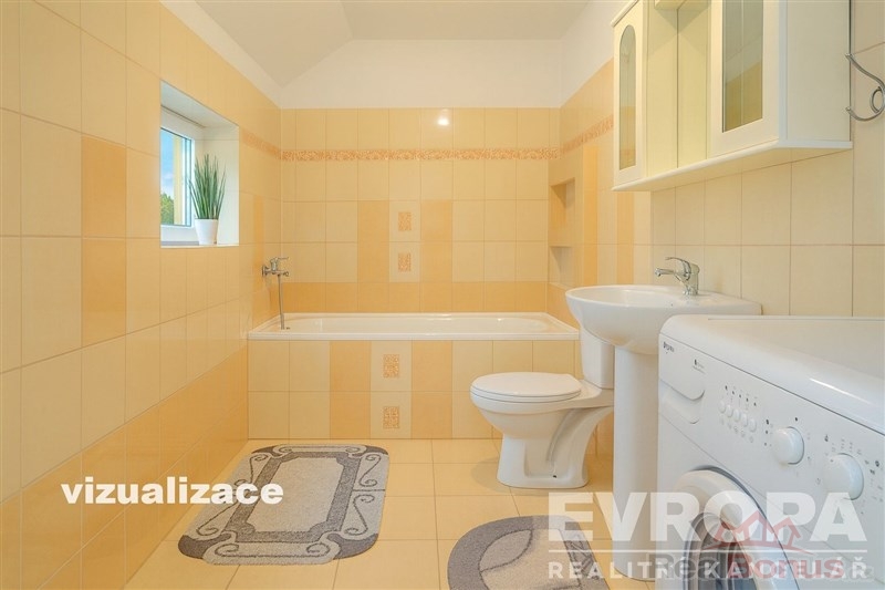 V přízemí je také koupelna s vanou a WC, menší úzká místnost využitelná jako zadní kuchyňka, komora (špajz) a dílna, do které je přístup právě přes zadní kuchyni. Díky členitému půdorysu lze místnosti jednoduše přizpůsobit vlastním potřebám.