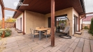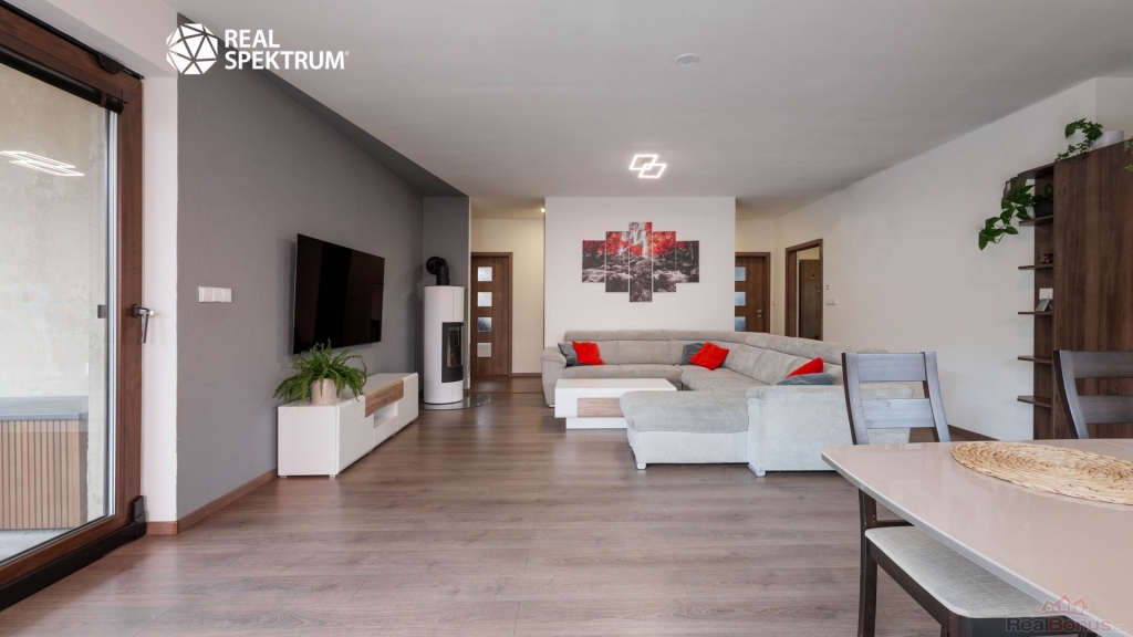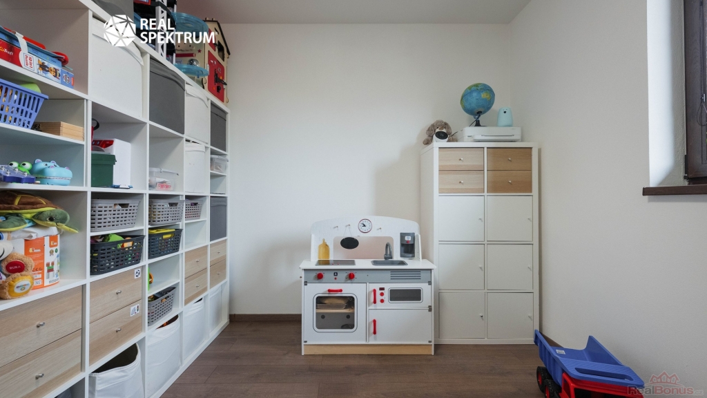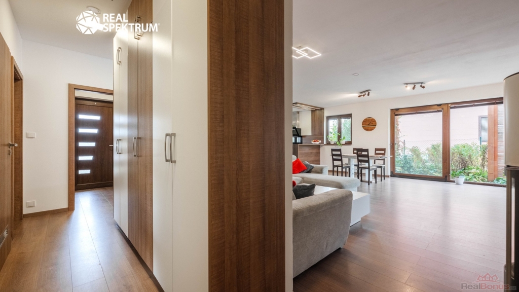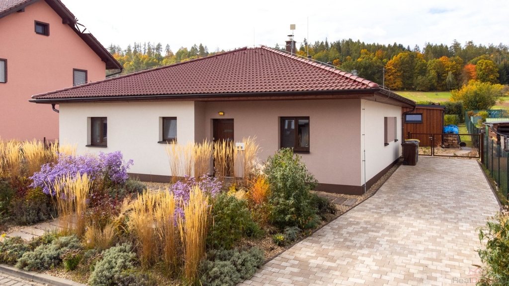 Na první pohled vás jednoznačně upoutá vzrostlá zahrada s pochozími chodníky, která podtrhuje krásu místa hned z ulice. Vstup do domu je orientován na východ. Tento zděný nepodsklepený dům s užitnou plochou 107m2 je předdefinovaný jako 4+kk, kde dominantou domu je prostorný obývací prostor s jídelnou a kuchyní o ploše 44 m2. Francouzské dveře rozšiřují komunikační zónu o krytou terasu se západní orientací. Skvělým benefitem je přímý výhled z kuchyně do zahrady, takže děti i návštěvy snadno obstaráte doslova mrknutím oka. Teplo domova vytváří nejenom jednotně sladěný interiér, ale taky krbová kamna, na které koukáte rovnou z pohovky. Vytápění celého domu je dále zajištěno podlahovým topením. Dispozice domu je do detailu dobře promyšlená - celý interiér působí vzdušně, prakticky a přitom nabízí dostatek úložných prostor pro rodinu i aktivní páry.
