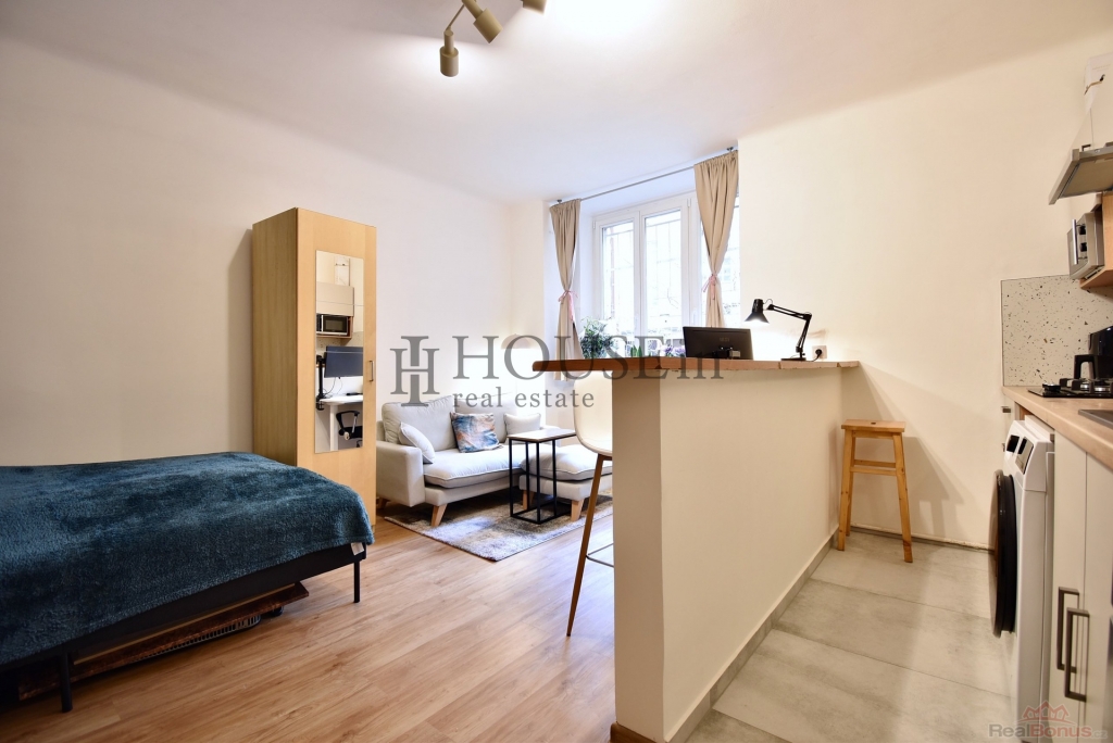 Ateliér je orientován do tichého vnitrobloku. Dispozici tvoří předsíň, koupelna se sprchovým koutem a WC a obytná místnost s kuchyňským koutem a barovým pultem. Jednotka je částečně zařízená ? nábytek může zůstat po domluvě s majitelem. Kuchyňská linka je vybavena lednicí s mrazákem, plynovým sporákem, digestoří a pračkou. Vytápění je zajištěno plynovými WAW, ohřev vody elektrickým bojlerem.
