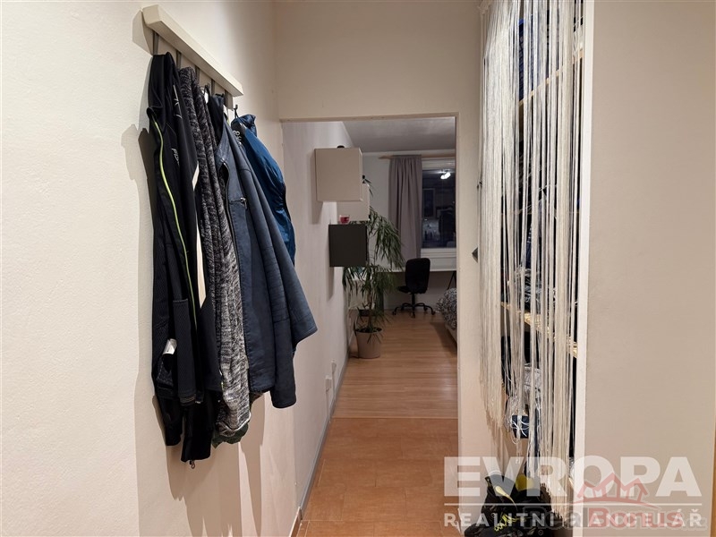 Vstupní chodba, koupelna s toaletou a pračka, pokoj s kuchyňským koutem, který je vybavený veškerými spotřebiči.