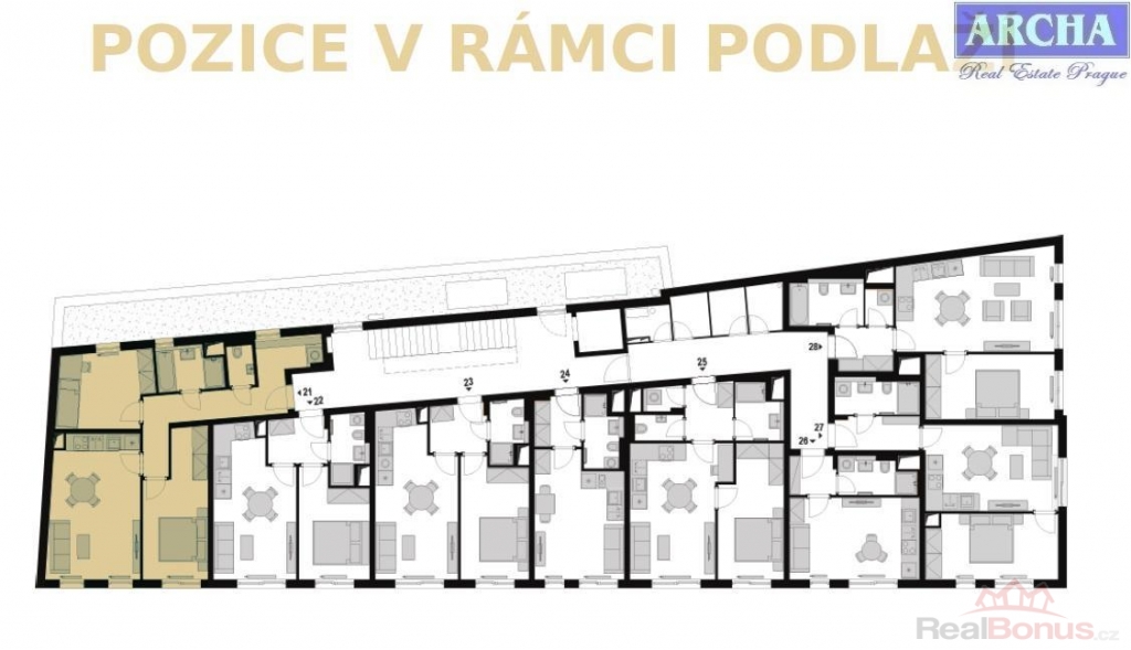 Byt o celkové ploše 105,9 m2 a podlahové ploše 73.9 m2 ve 2. podlaží nabízí velkorysý obývací pokoj s přípravou na kuchyňský kout, dvě ložnice, prostornou vstupní chodbu, praktickou šatnu a nadstandardní koupelnu svanou i sprchovým koutem a samostatnou toaletou. K bytu náleží také soukromá střešní terasa, sklepní kóje a garážové stání.