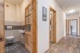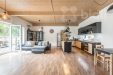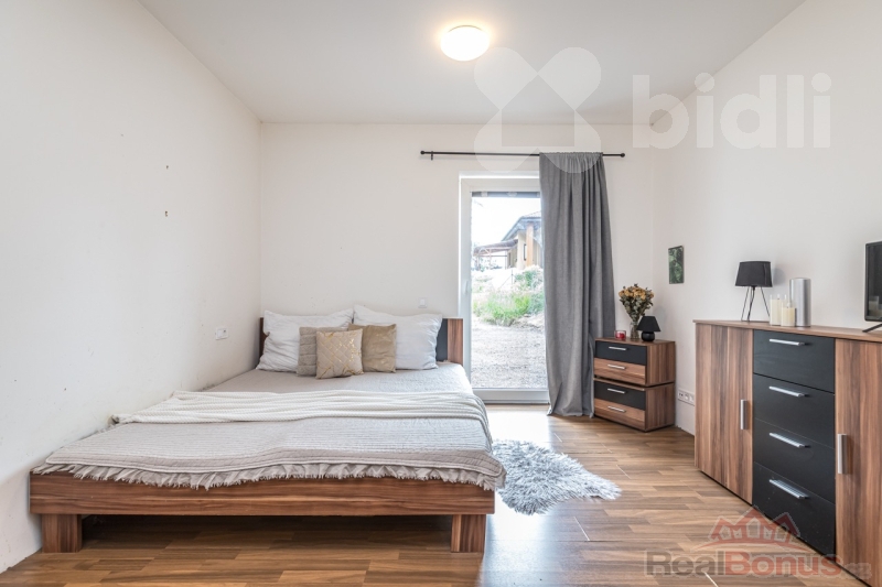 Dispozice domu zahrnuje světlý obývací pokoj propojený s kuchyňským koutem, který je vybaven moderní kuchyňskou linkou a vestavěnými elektrospotřebiči. Dále zde najdete tři samostatné pokoje, z nichž hlavní ložnice disponuje vlastní prostornou šatnou. Koupelna je vybavena vanou, sprchovým koutem, toaletou a dostatkem úložného prostoru. Druhé, samostatné WC s umyvadlem, se nachází poblíž vstupu do domu. V technické místnosti je připraveno zázemí pro pračku, sušičku a úklidovou techniku. Podlahy jsou řešeny kombinací plovoucí laminátové podlahy a keramické dlažby.