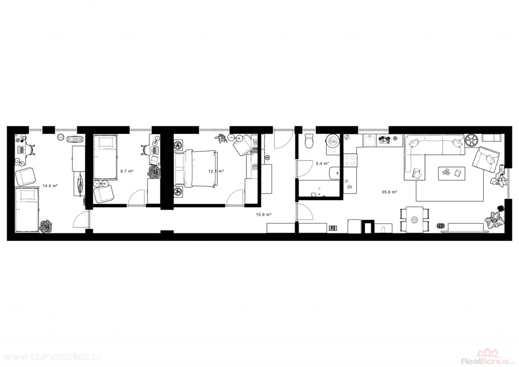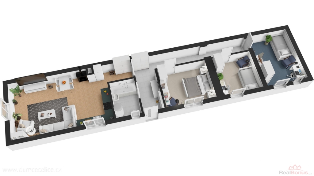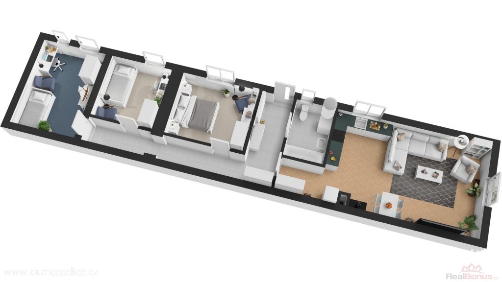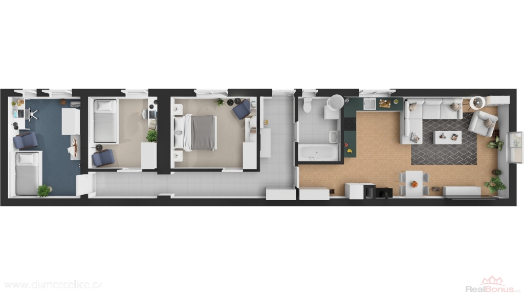 Vstoupíte do obývacího pokoje s kuchyňským koutem a prostorem pro jídelní stůl. Dále jsou tři samostatné pokoje a koupelna s vanou. Na dům navazuje stodola a půda vhodná k vestavbě obytného podkroví.