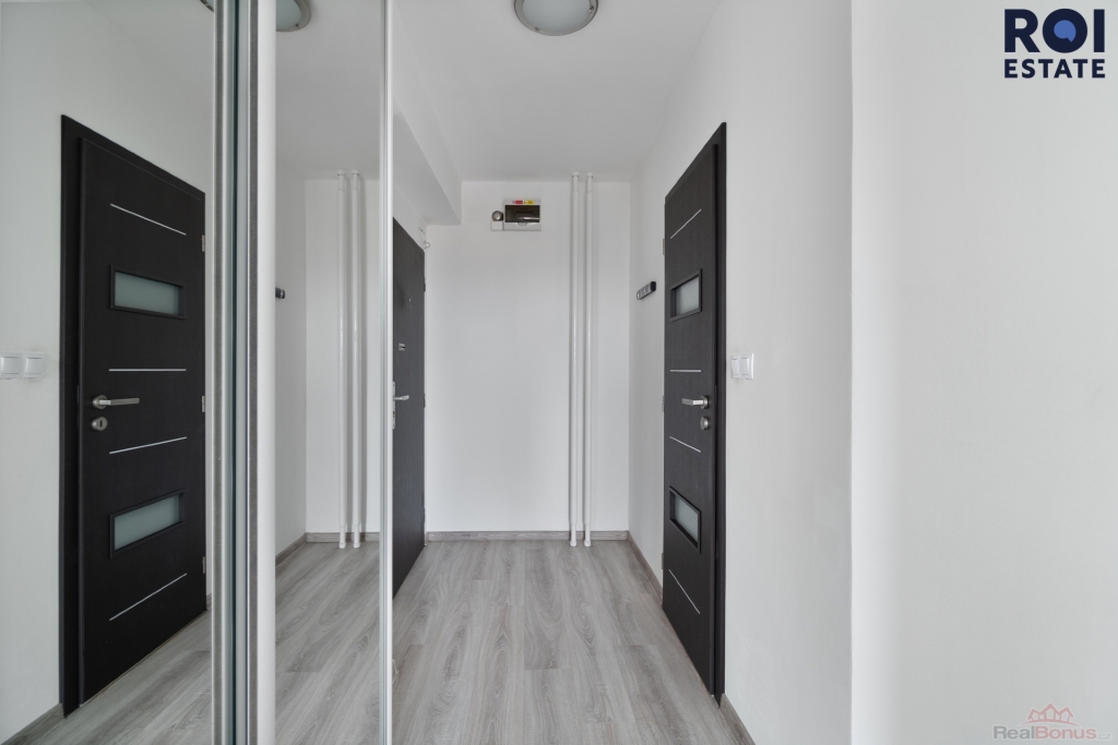 Byt je světlý a prostorný. Po vstupu do něj se ocitnete na chodbě s vestavěnou skříní, která ústí do srdce bytu ? obývacího pokoje s kuchyňským koutem. Moderní kuchyňská linka je vybavena vestavěnou myčkou, kombinovanou lednicí s mrazákem, el. troubou a plynovým sporákem. Z chodby se rovněž dostanete do koupelny s toaletou, sprchovým koutem a kombinovanou pračkou se sušičkou a dále do neprůchozí ložnice.