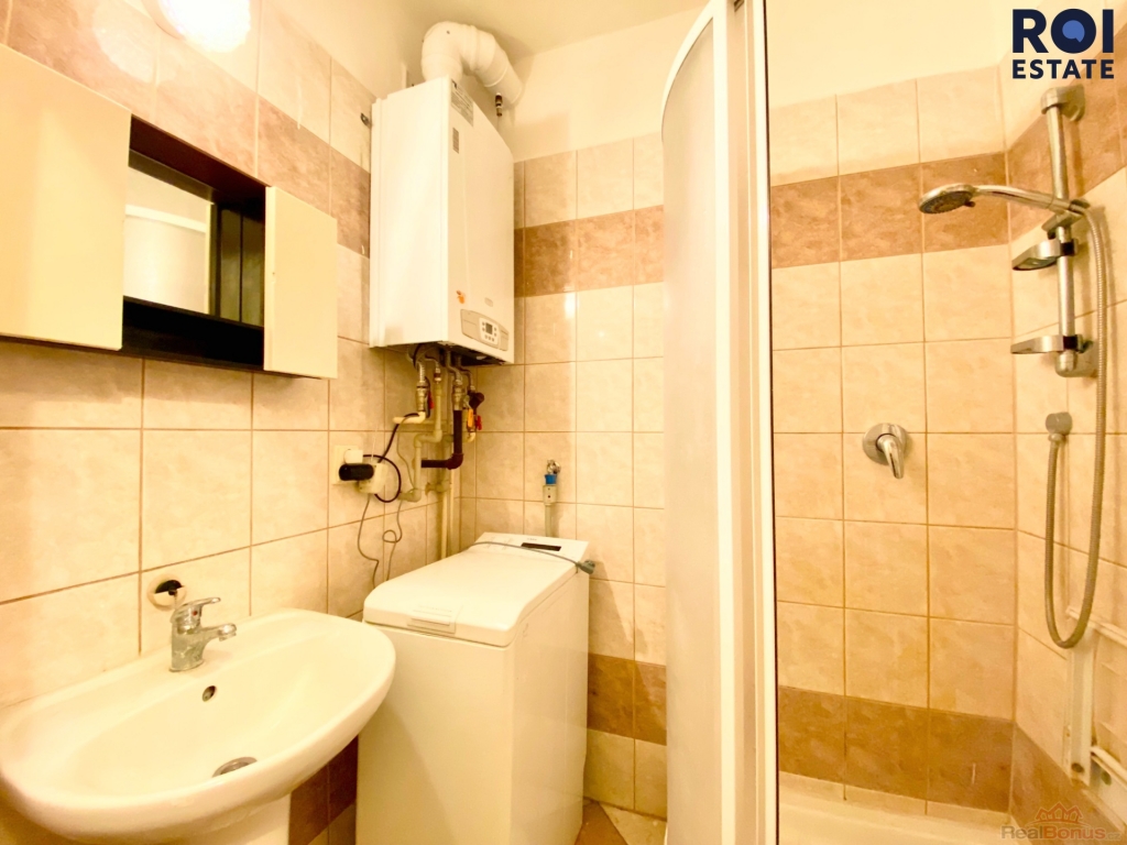 Koupelna je osazena prostorným sprchovým koutem a je vybavena automatickou pračkou. Je v ní umístěn výkonný kotel, který zajišťuje dostatek teplé užitkové vody pro celou rodinu i teplíčko v bytě.