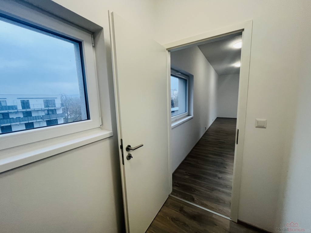 K dlouhodobému pronájmu nabízíme velmi prostorný a světlý byt o dispozici 1+kk (40 m2) s terasou (20 m2) ve 4. nadzemním podlaží Rezidence Zámecká. Byt je velmi pěkně situován na konci chodby 4. patra této novostavby. V chodbě je šatní stěna, odkládací a úložný pult s možností připojení pračky. V koupelně je společně wc a sprchový kout v nadčasovém designu. Kuchyňská linka s lednicí je součástí vybavení. Dominantou bytu je veliké francouzské okno se vstupem na velkou terasu.