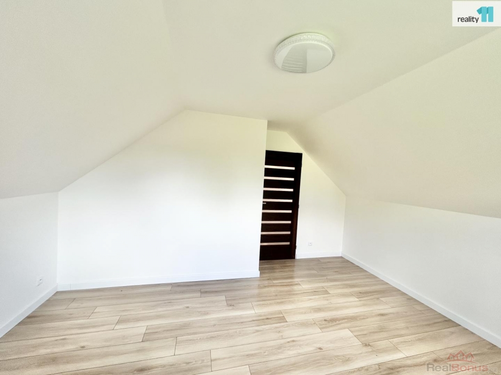 Po schodech nahoru z obývacího pokoje se nachází dva samostatné pokoje (15m a 16m) a druhá koupelna se sprchovým koutem a WC.