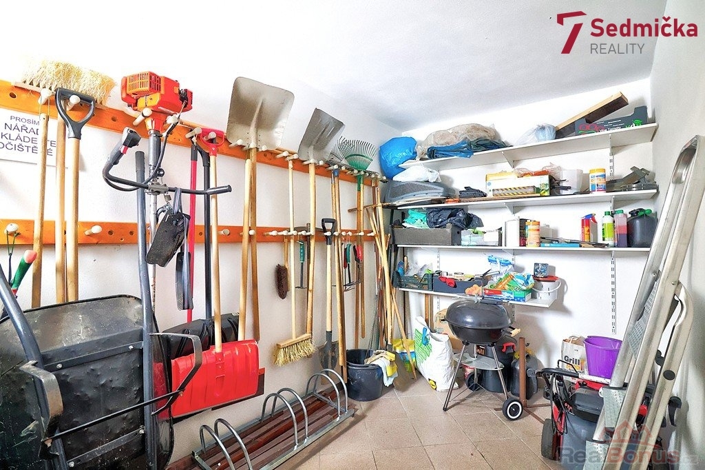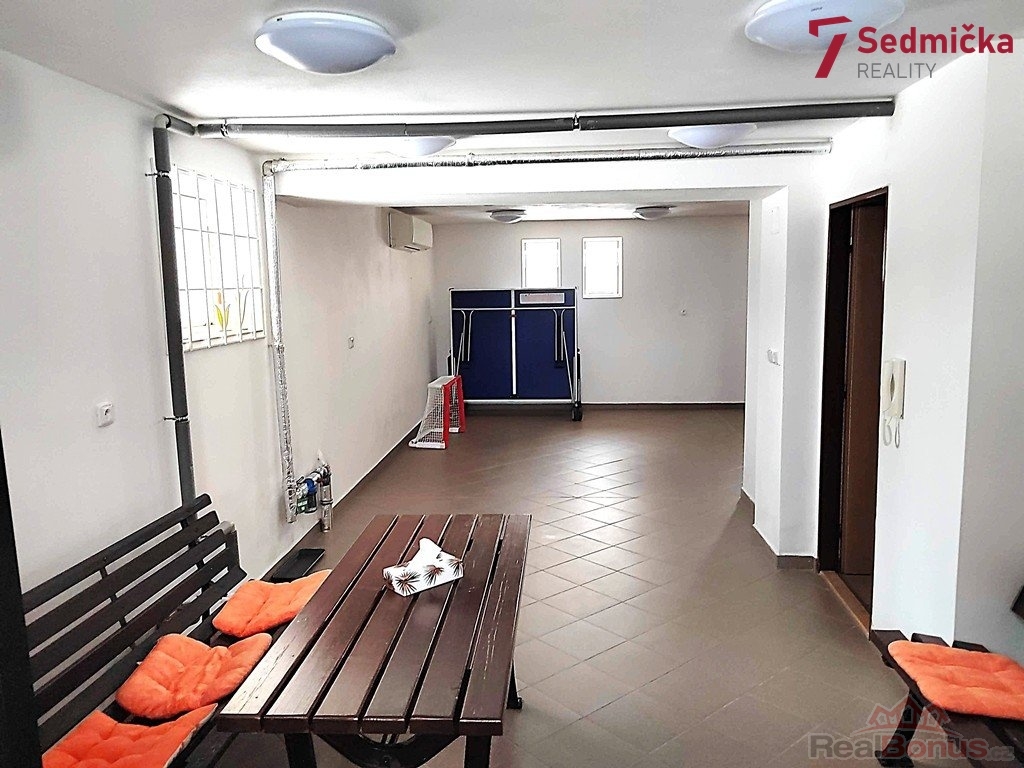 Také lze využívat společenskou místnost v suterénu s vytápěním, kde je možné provozovat různé aktivity, od dětských a sportovních (vybaveno stolem pro stolní tenis a brankami pro hraní dětského florbalu) až po různé oslavy narozenin, domovních schůzek, aj. Také zde je umístěno letní vybavení k ohništi v zahradě - stoly, gril a další.