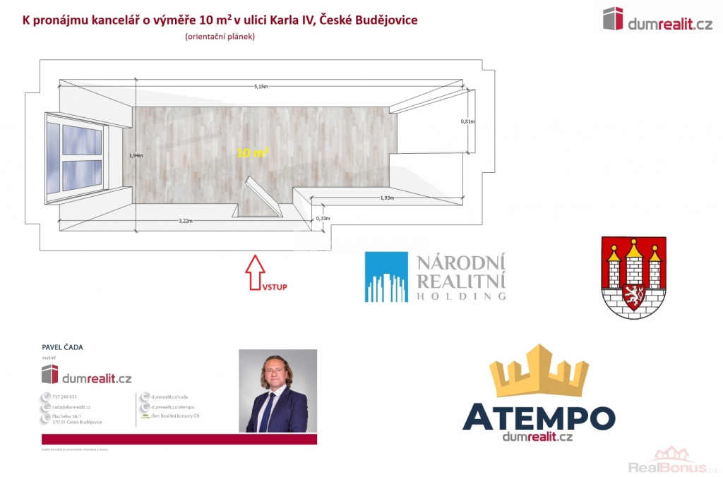 + poplatky ve výši 1.351,- Kč. Více informací vám poskytne makléř Pavel Čada., Dumrealit.cz Vám zprostředkuje pronájem světlých komerčních prostor o celkové ploše 10 m v exkluzivní lokalitě na náměstí Přemysla Otakara II., České Budějovice. Prostory lze využít jako kancelář. Podrobné rozkreslení prostoru naleznete na orientačním plánku mezi fotografiemi. Nájemné činí 1.744,- Kč + poplatky 1.351,- Kč měsíčně. Doporučuji osobní prohlídku, prostor je připraven k užívání. Více informací Vám poskytne realitní makléř Pavel Čada z RK A TEMPO fungující pod ochranou známkou dumrealit. Ev. číslo: 653226. Energetický štítek: G