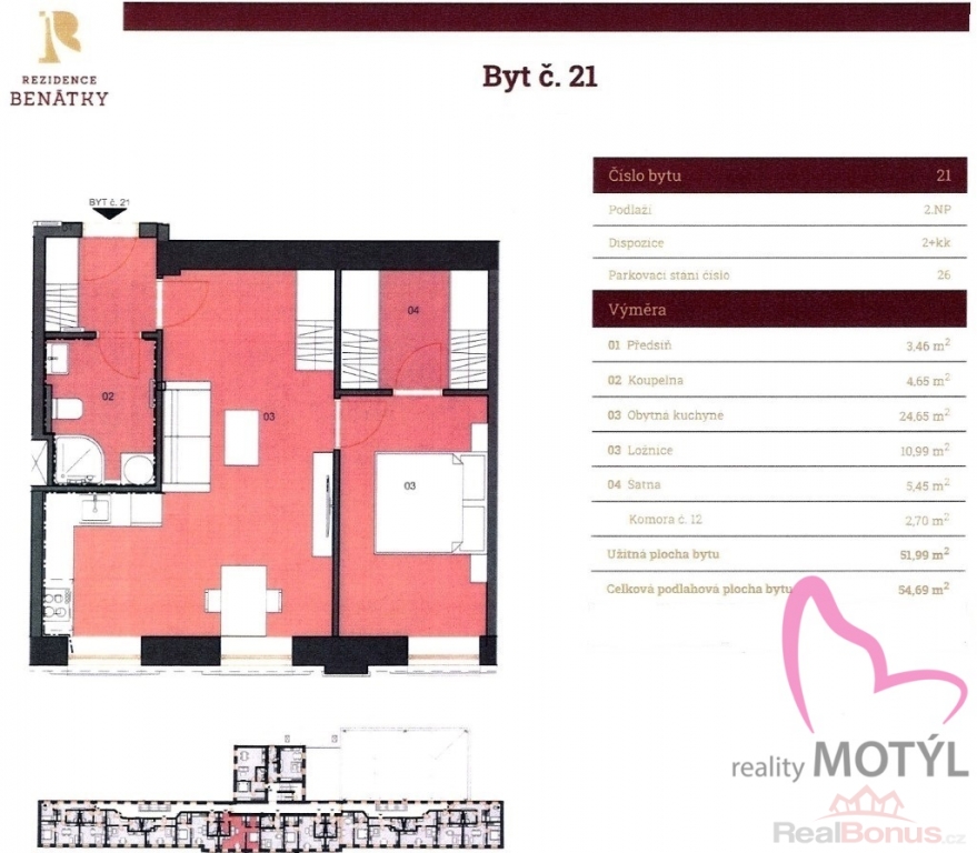 Ve výhradním zastoupení majitele si vám dovoluji nabídnout tento skvostný byt, který je určen k dlouhodobému pronájmu. Byt se nachází v 1. patře v nově zrekonstruovaném objektu residence Benátky. Sestává z předsíňky, obývacího pokoje s kuchyňským koutem, ložnice, velkorysé šatny a koupelny se sprchovým koutem. K dispozici je také sklep, možnost zahrádky ve vnitrobloku. Možnost parkovacího stání za 1.000 Kč / měsíc. Měsíční nájem činí 12.000 Kč + zálohy na energie cca 5.500 Kč. Peněžitá jistota 24.000 Kč, provize 12.000 Kč. Hledáme 1-2 pohodové nájemníky. Volný od 1. 2. 2026. Vážné zájemce zveme na prohlídku. Reality s lehkostí.